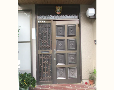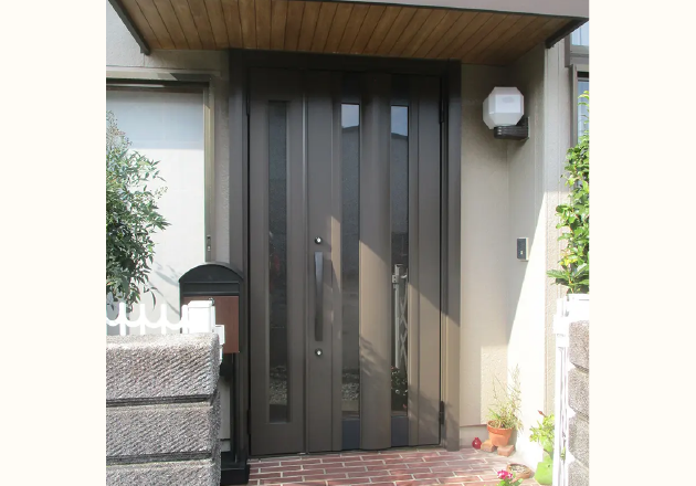 顧客の方から連絡があり、玄関ドアが不調との事で年数も経っていることから取替でご提案しました。 カバー工法での取替工事なので1Dayリフォームとしてとても人気があります。あとは、玄関庇の木部が傷み始めていたので、板金で巻いてあげることにより傷みが進む心配もなくなりました。